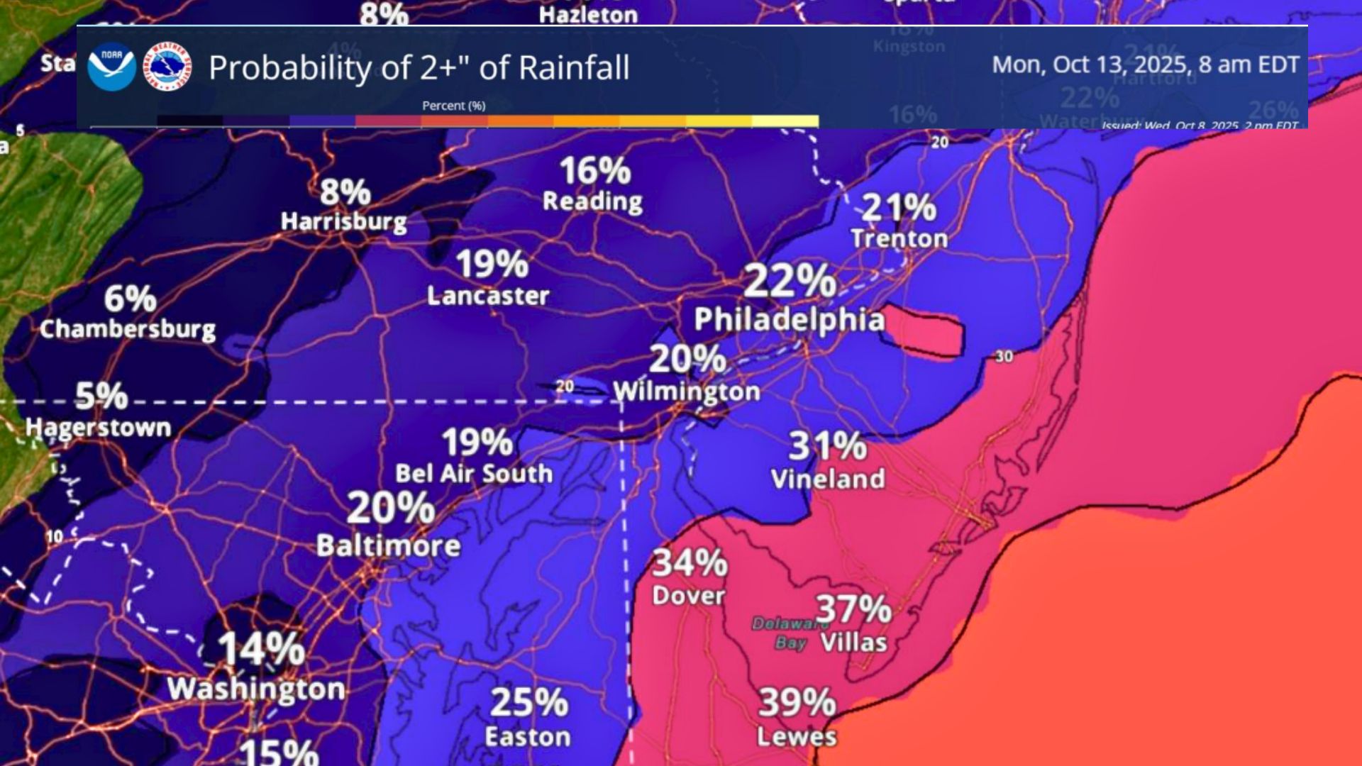 Along with coastal impacts, the Weather Service is tracking a high probability of heavy rainfall, potentially exceeding two inches across much of the region.