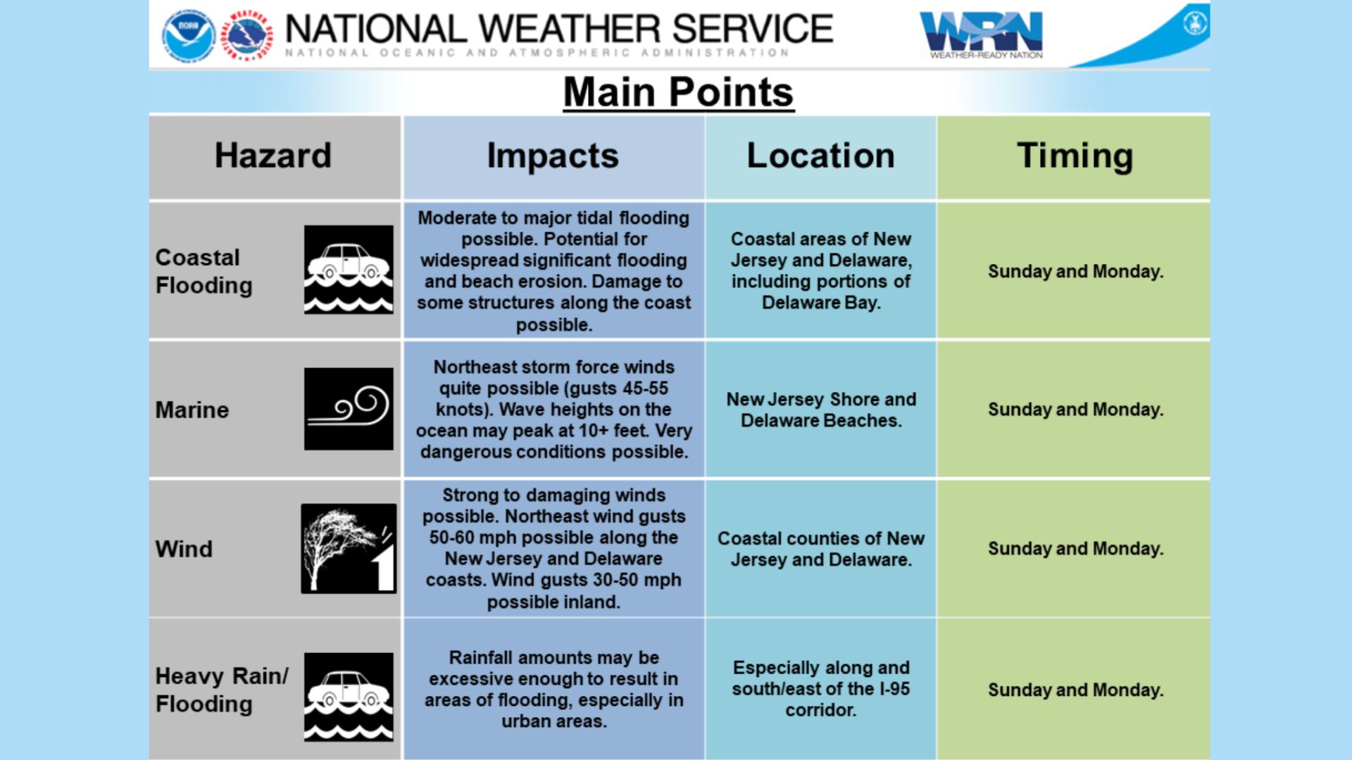 The National Weather Service in Mount Holly said Thursday that the system, expected to arrive Sunday into Monday, could produce moderate to major coastal flooding, beach erosion, and waves exceeding 10 feet along the Atlantic coast and Delaware Bay.