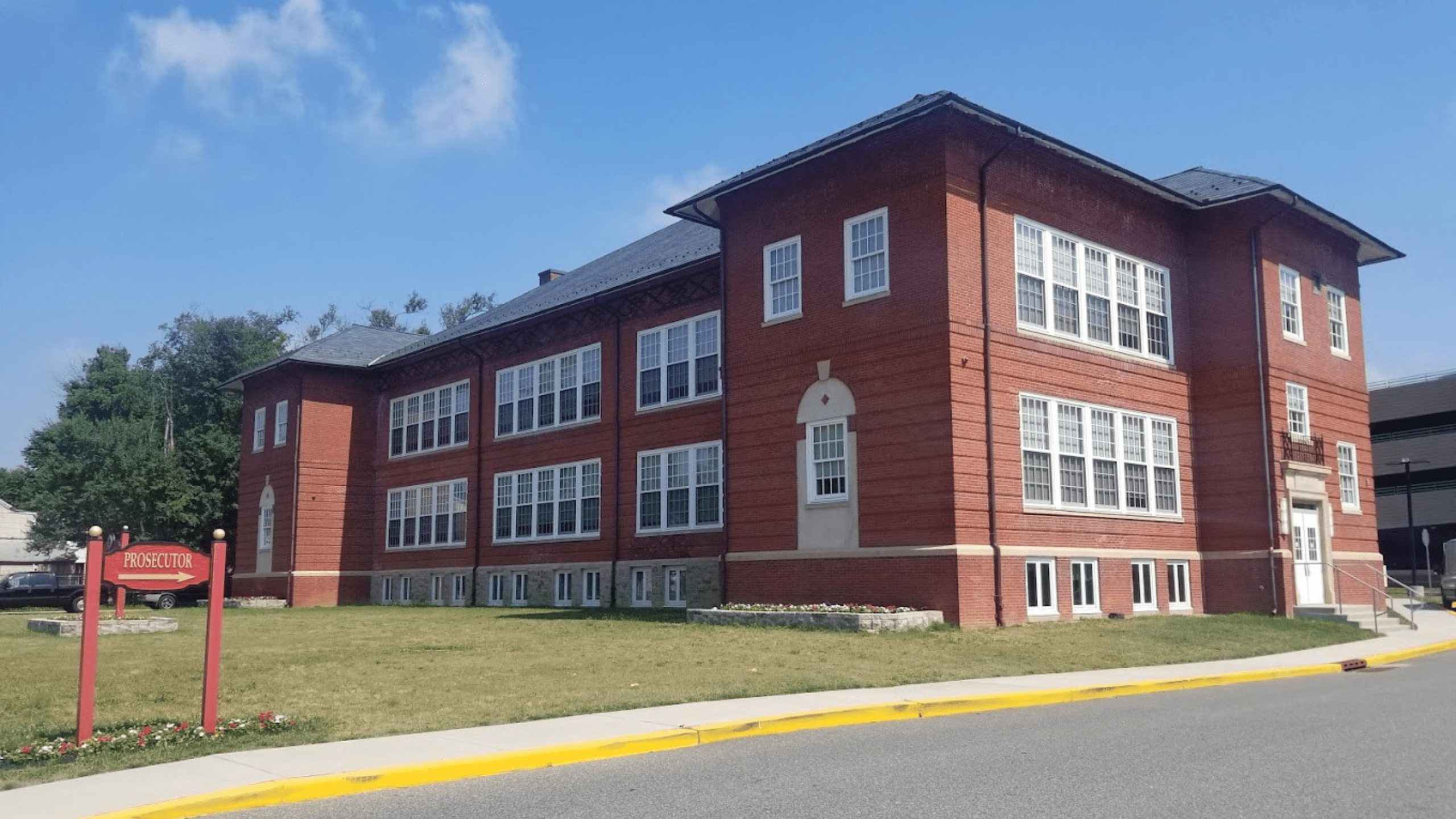 A red brick school building with large white-framed windows.