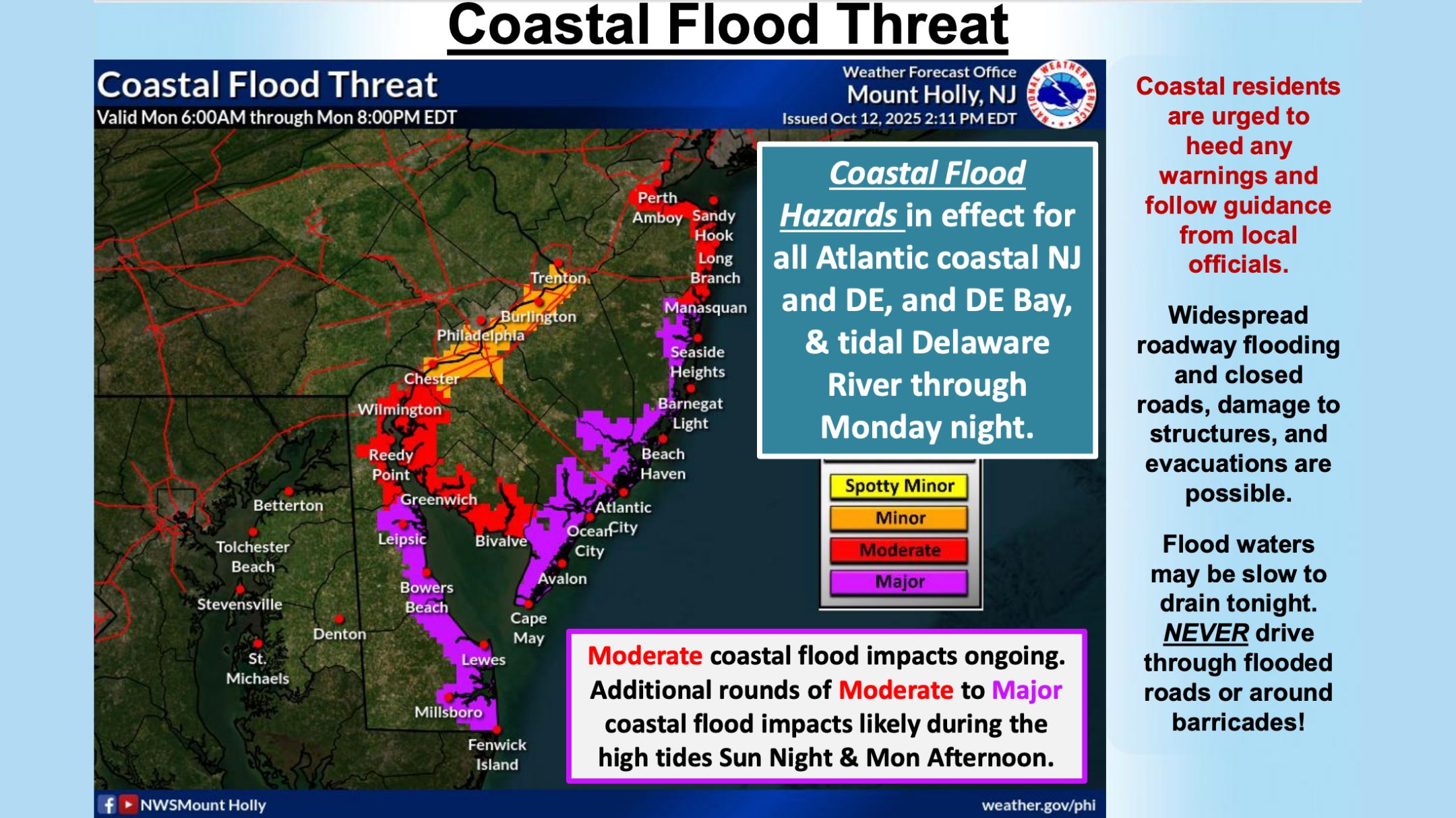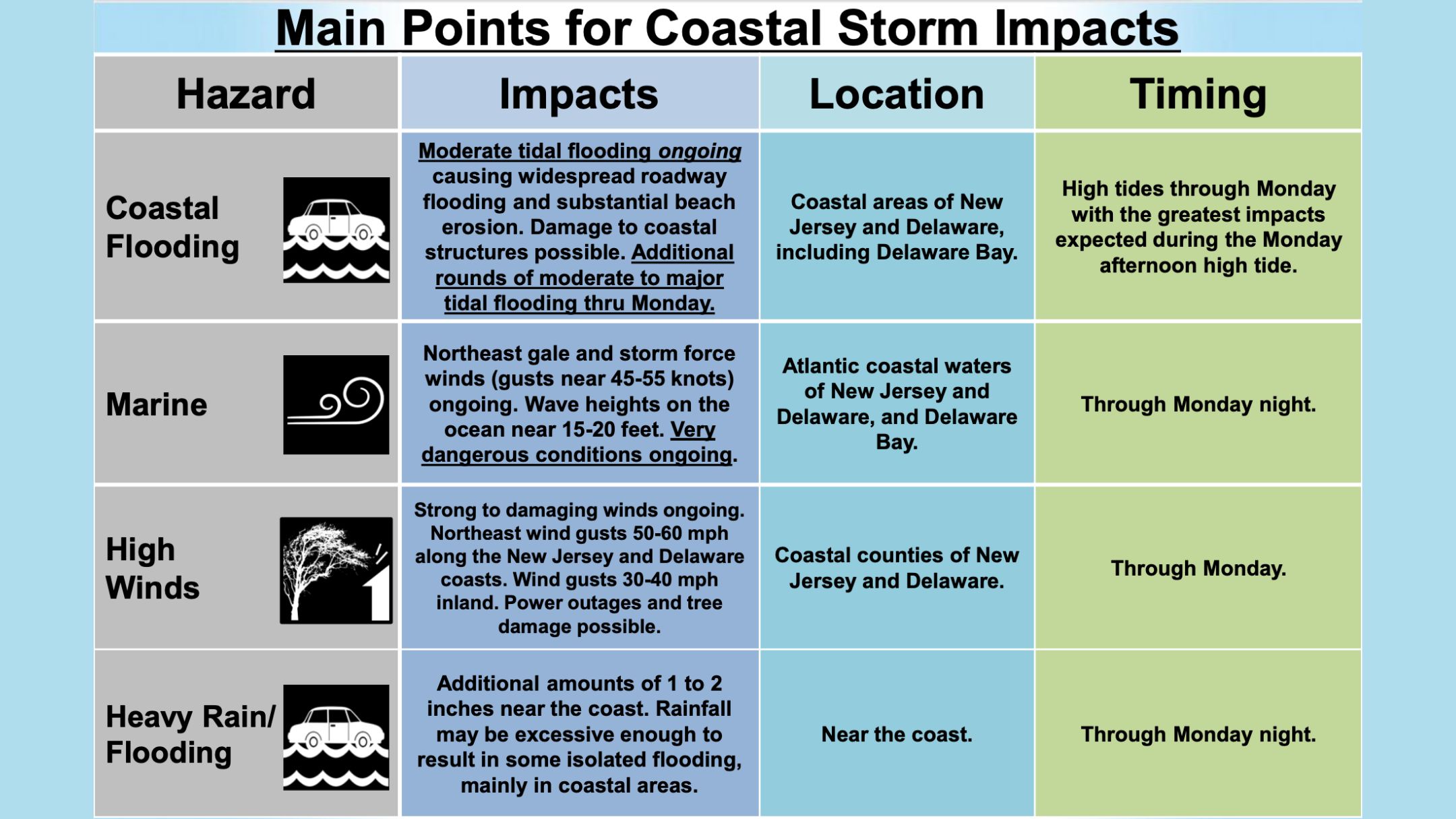 Strong northeast winds continue across coastal New Jersey and Delaware, with gusts between 50 and 60 mph along the coast and 30–40 mph inland. These winds are expected to peak overnight and into early Monday morning before gradually diminishing through the day.