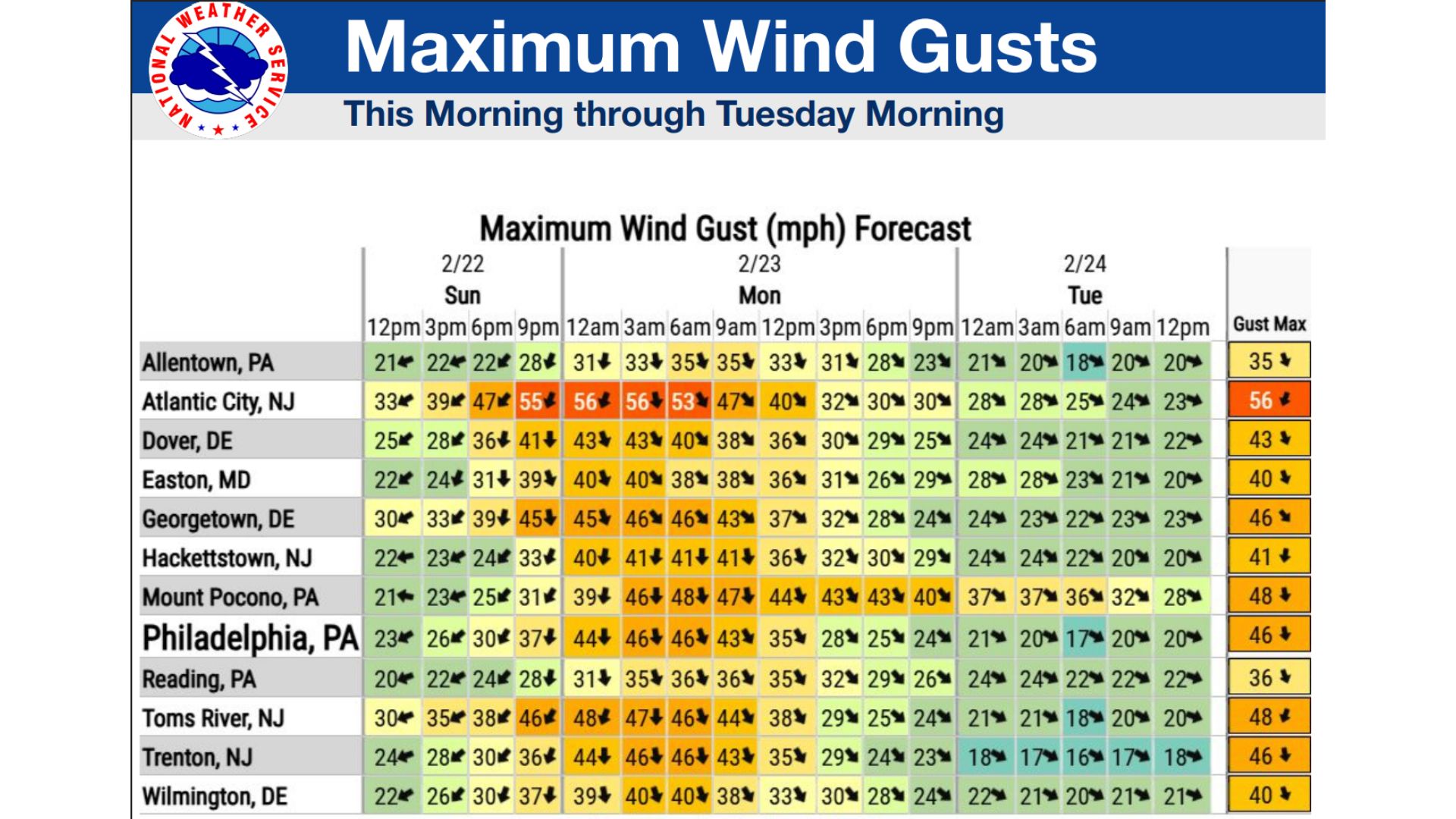 Coastal flooding is also a major concern. Coastal Flood Warnings remain in effect for Middlesex, Monmouth, Ocean, southeast Burlington, Atlantic, and Cape May counties in New Jersey, as well as Kent and Sussex counties in Delaware. A Coastal Flood Advisory has been issued for Cumberland County.