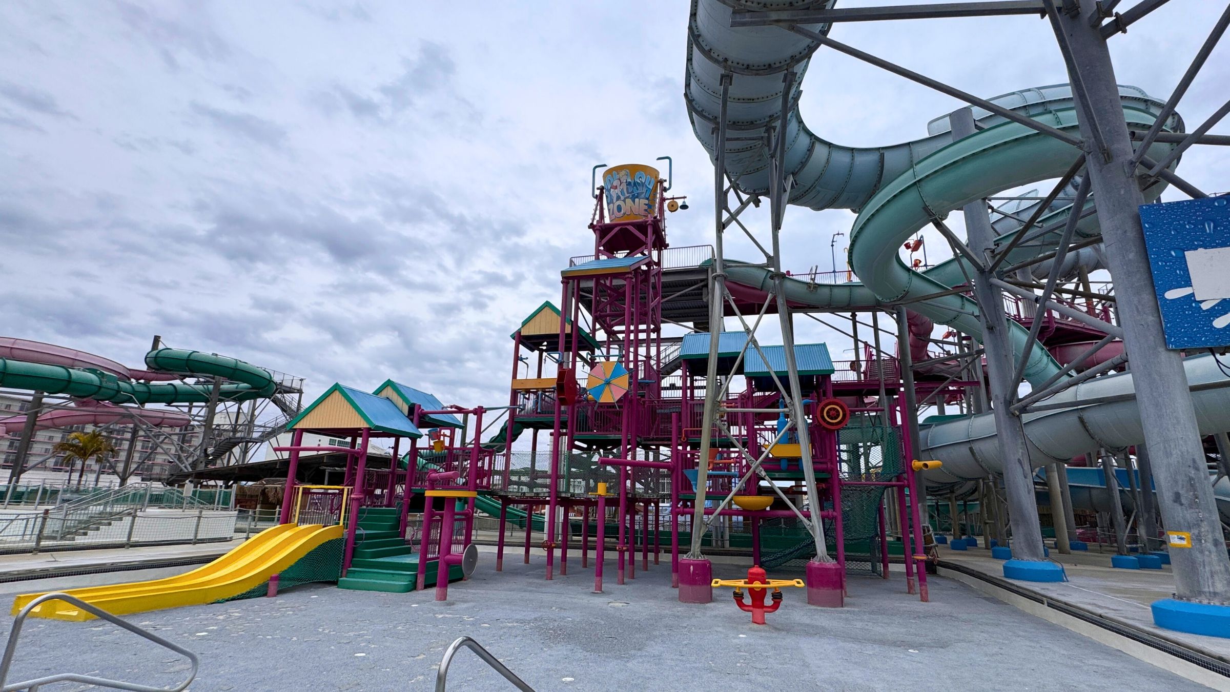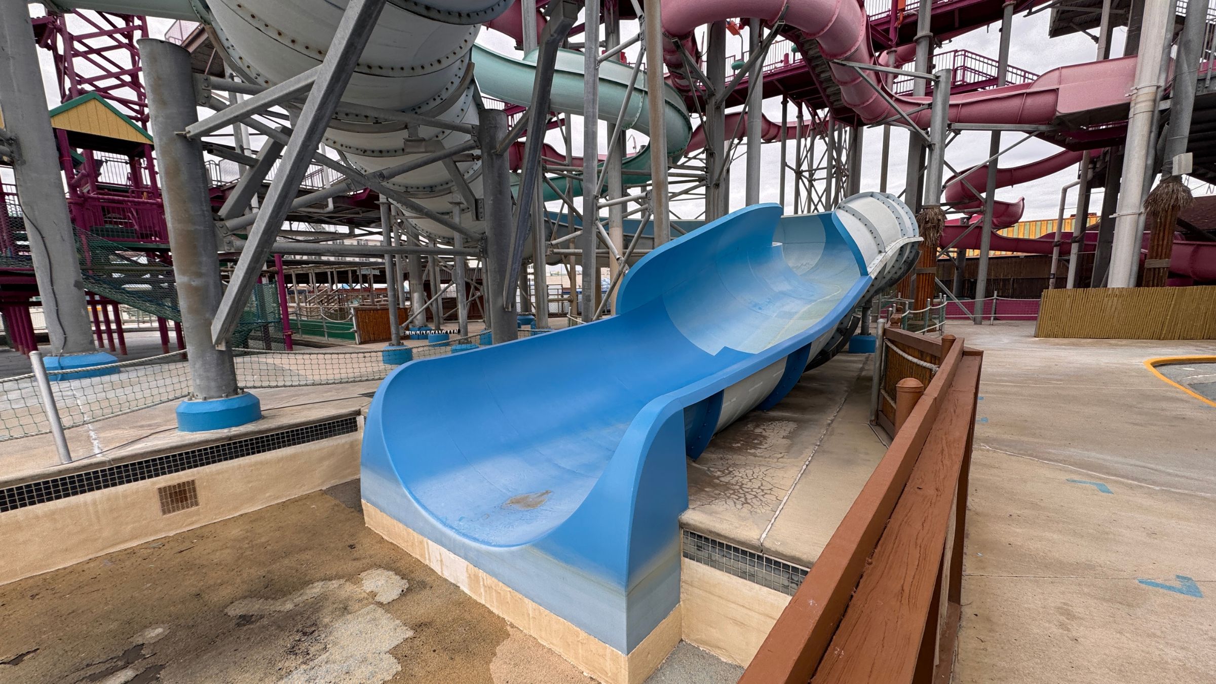 Walking the empty walkways was surreal. Without running water, the slides looked like hollow shells. The top platforms were quiet. The splash pools were drained. The giant bucket on Hurricane Island stood frozen mid tilt. Dino Dig sat abandoned with a few scattered jewels left behind. The entire waterpark looked as if it closed for the night and never reopened.