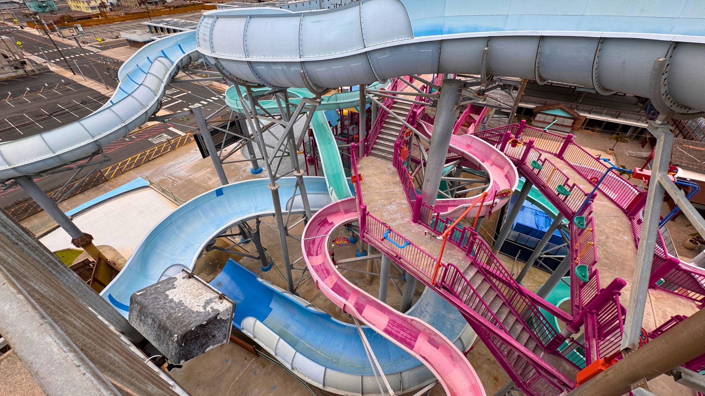 Popular thrill rides included Midnight Run, a pitch black tube slide unique to Splash Zone, along with fast body flumes like The Abyss, The Terminator, and the competitive Speed Dominator. All of these attractions remained fully intact during our walkthrough, creating an eerie contrast between their silent stillness and the decades of Wildwood memories they once created.