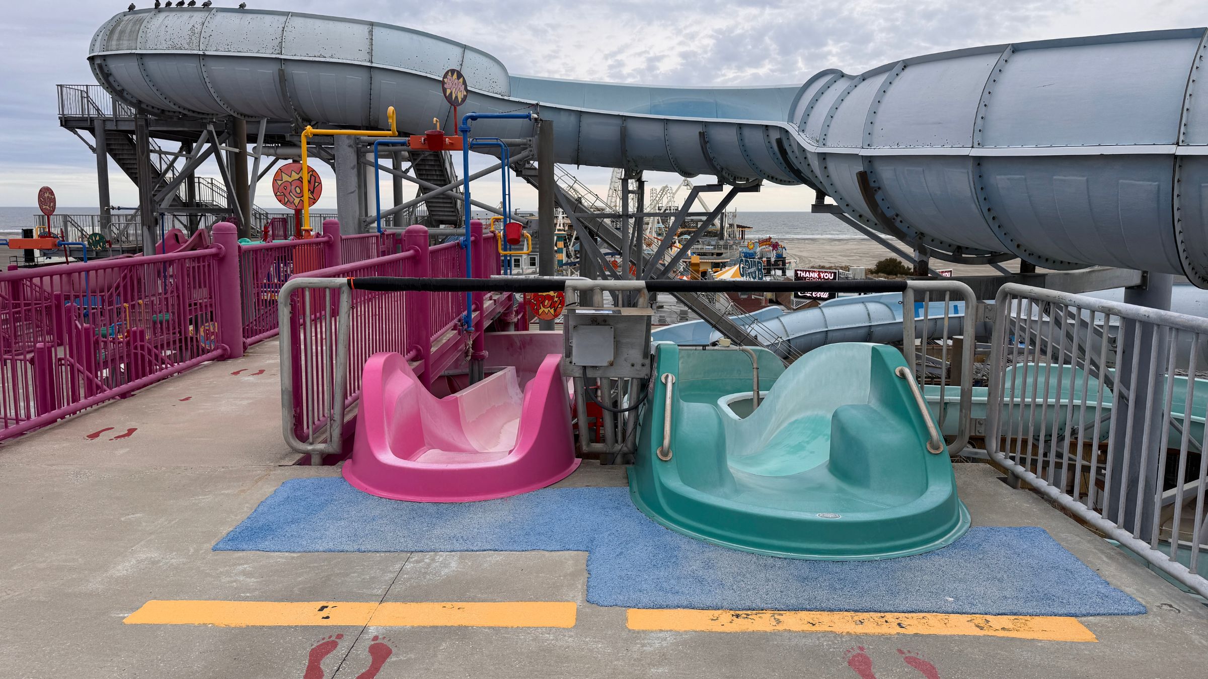 When Splash Zone opened, it immediately became one of the Boardwalk’s most energetic and modern attractions. With its bright color palette and towering slide structures, it could be spotted from blocks away. The giant dump bucket on Hurricane Island spilled water every fifteen minutes and became a beloved Wildwood sound that echoed down the Boardwalk all summer long, complete with its countdown clock and bell.