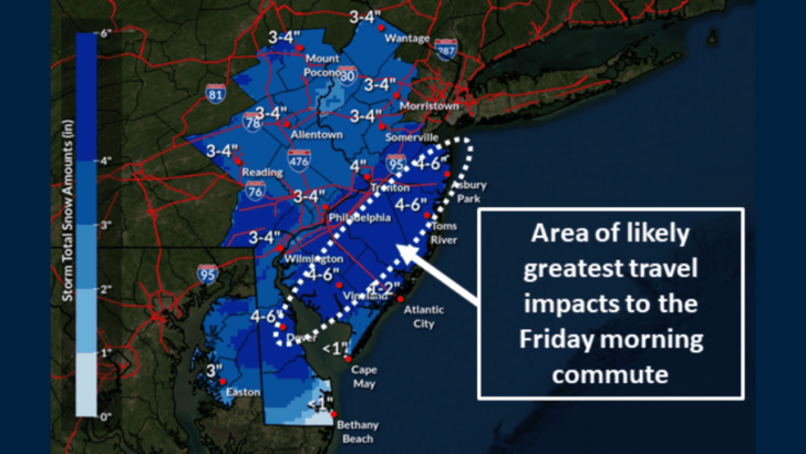According to the National Weather Service in Mount Holly, A period of snow is expected to bring widespread accumulating snowfall to the region tonight through Friday morning with most snow falling between 1 AM and 7 AM.