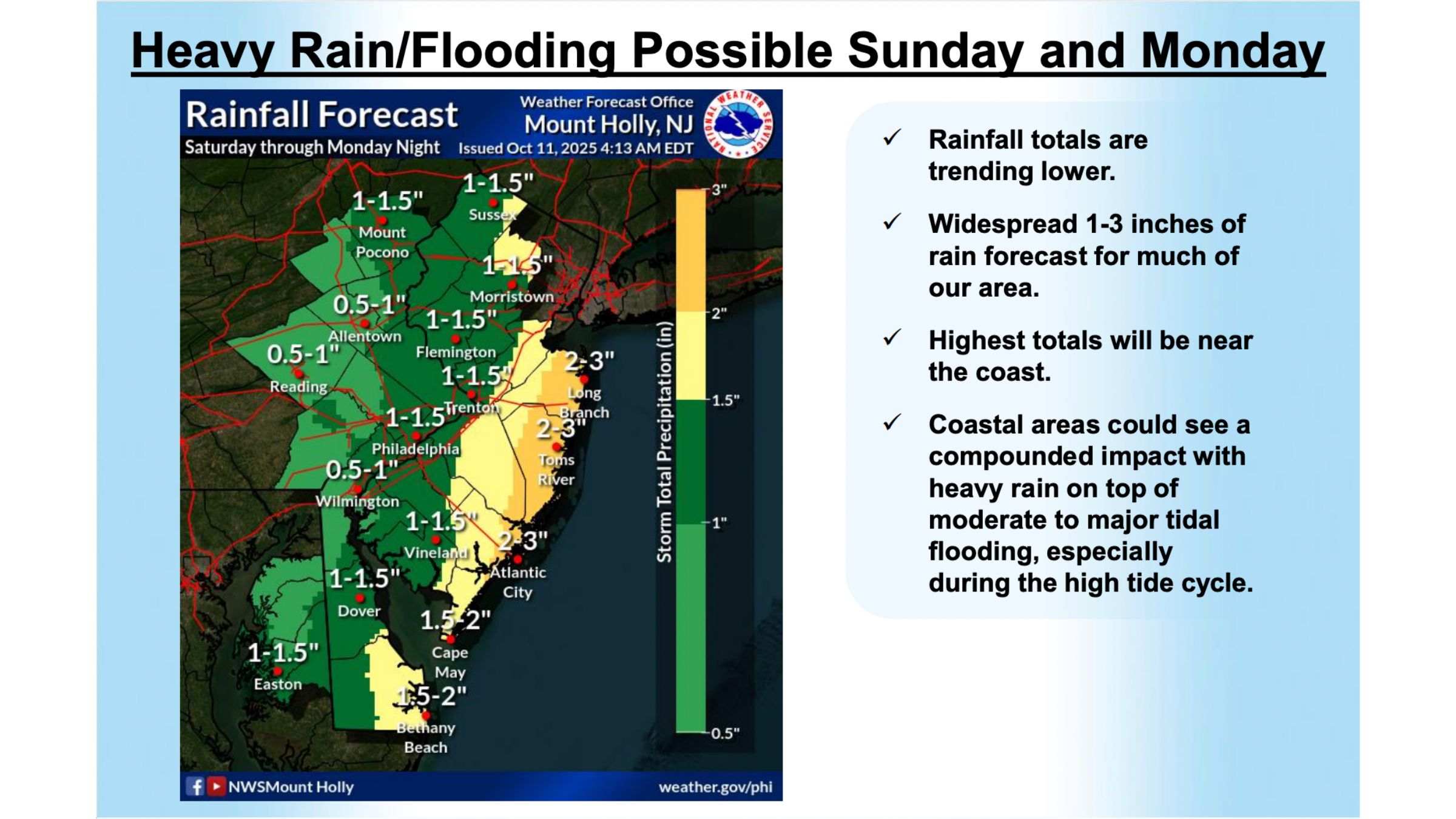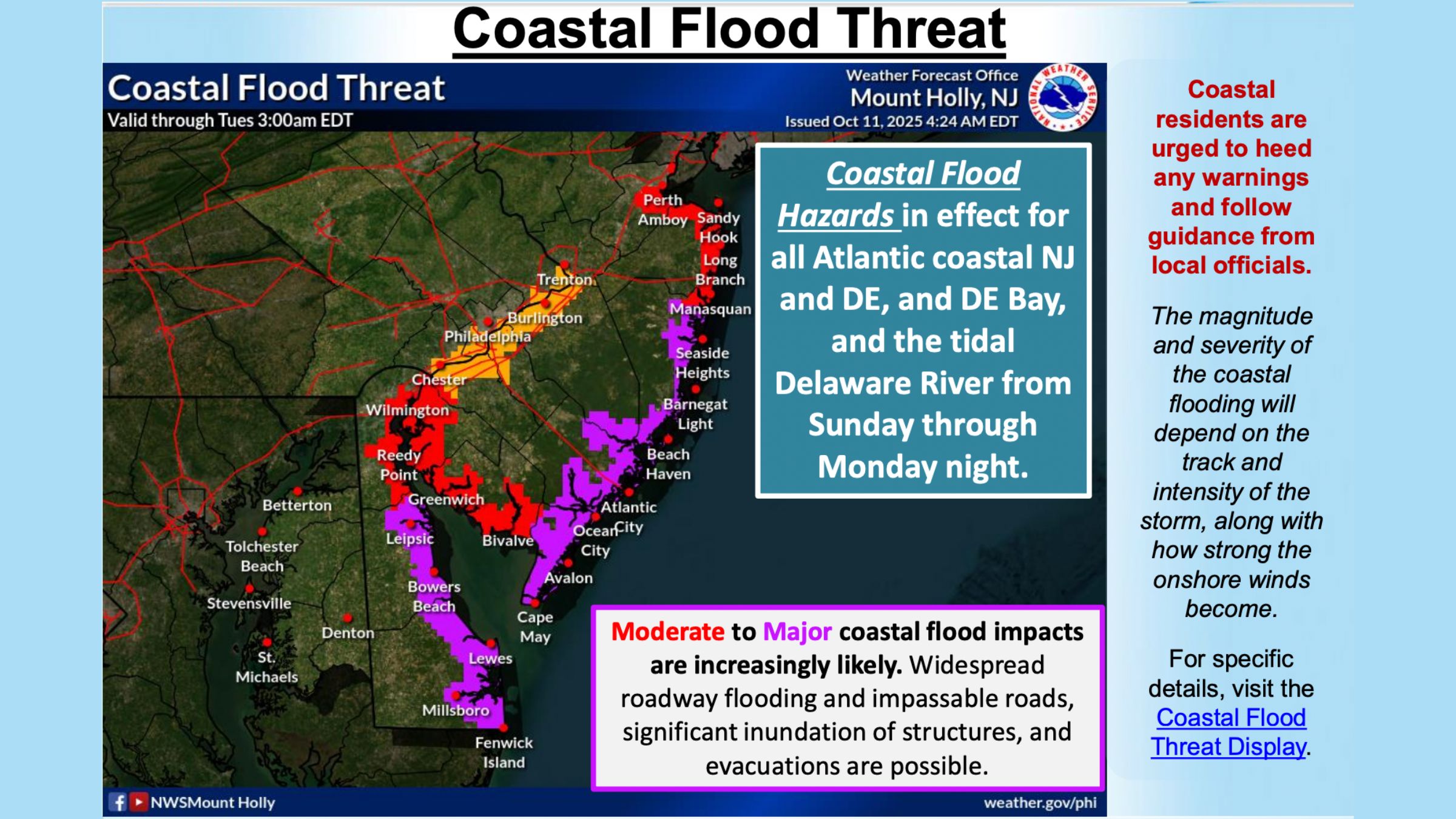 New Jersey officials are urging residents in flood-prone areas to prepare early as forecasts call for moderate to major coastal flooding, high winds, and heavy rain throughout the weekend and into Monday.