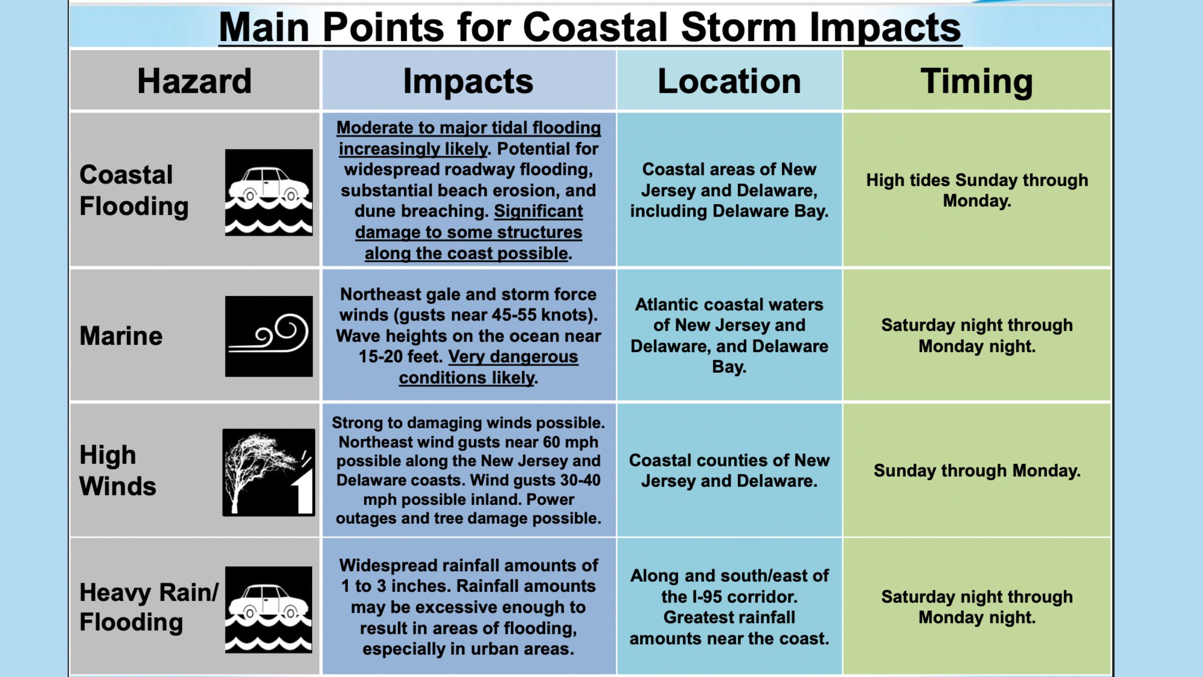 These conditions will be dangerous for both marine and coastal communities, and residents should avoid travel during periods of peak winds and flooding.