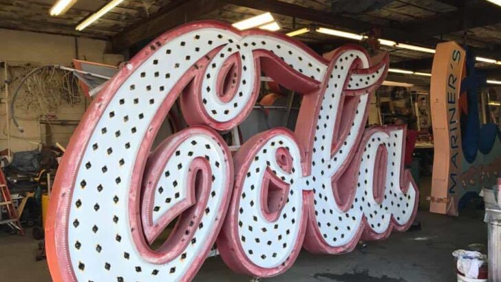 Vintage roadside sign welcoming to Zeenville with an American flag and a building in the background.